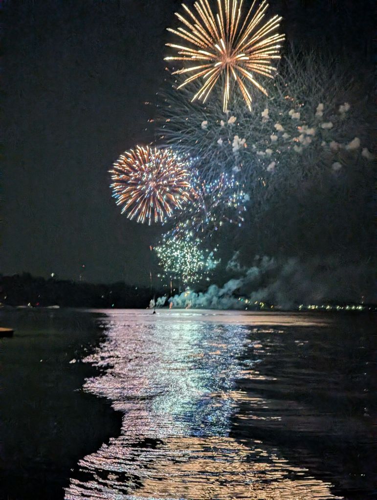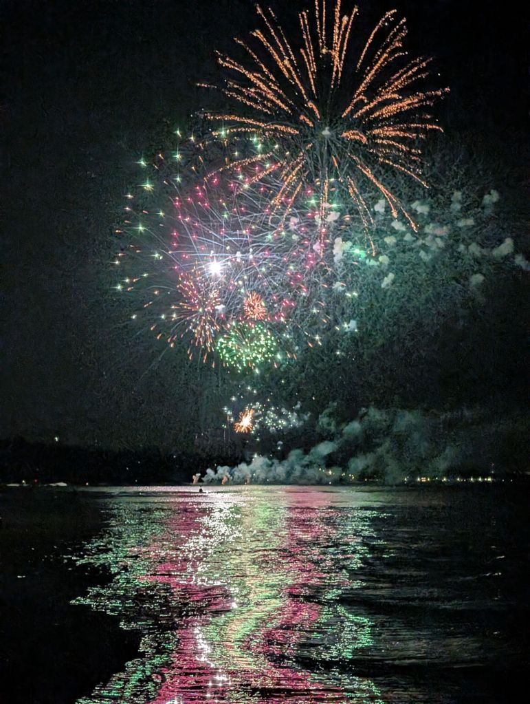 I går kväll när vi precis skulle stänga för att gå och lägga oss hör vi fyrverkerier och skyndar ner till sjön.
