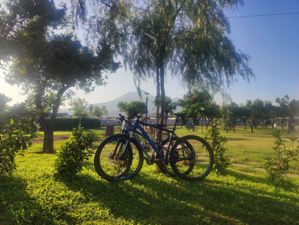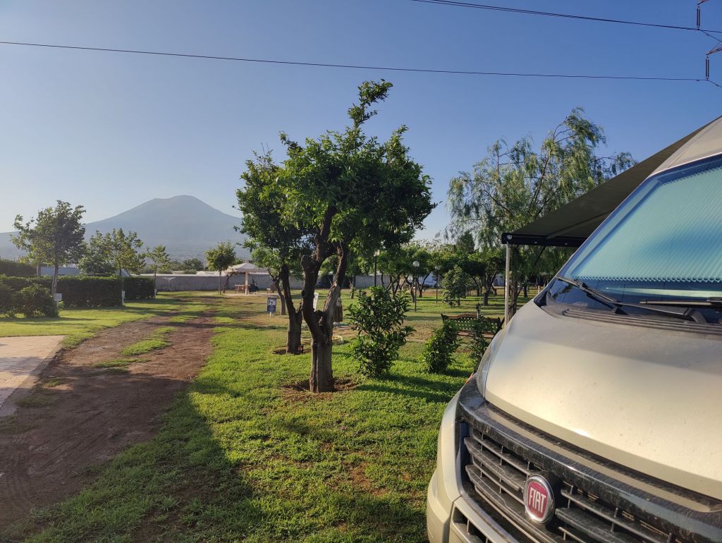 Vi fick en fin plats på ställplatsen Villa Julia med utsikt mot vulkanen Vesuvius. Det var den som år 79 e kr fick ett utbrott och begravde hela Pompeji.